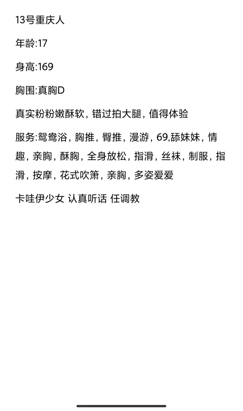 信息分类:楼凤兼职 地区:浙江省-宁波 信息来源:亲自探路! 年龄:00后 颜值身材:极品! 服务项目:各种项目都有,舒服死 价格:1-2K 环境设备:公寓 详细地址:本段信息已隐藏,请先登陆。点击登陆 , 或者 点击注册 联系方式(QQ号):本段信息已隐藏,请先登陆。点击登陆 , 或者 点击注册 详细介绍: 兄弟们,良心保证绝对真实,就前几天刚去玩的,新到的极品嫩妹,毛都没长齐,胸C,软的要死,一碰就出水,关键服务还好,一整套流程下来,让人欲仙欲死,照片对标本人,一点没作假,要不是没有小姐币了,才不拿出来卖 楼凤兼职